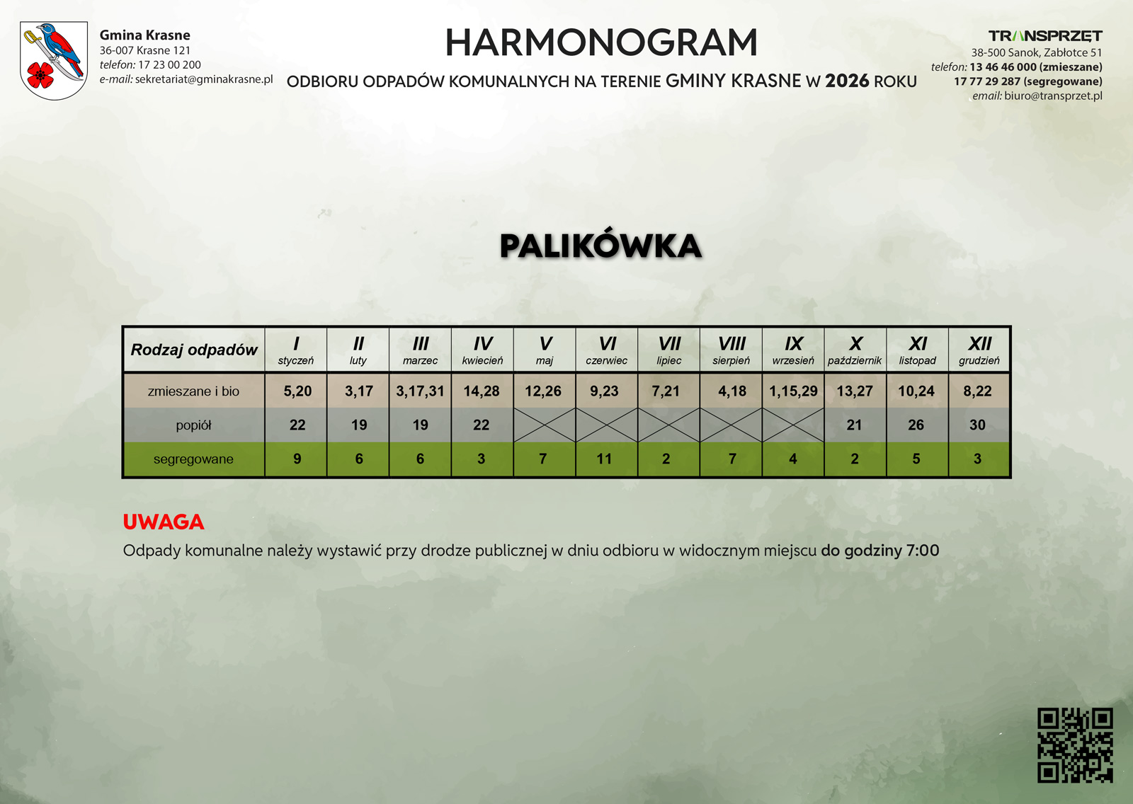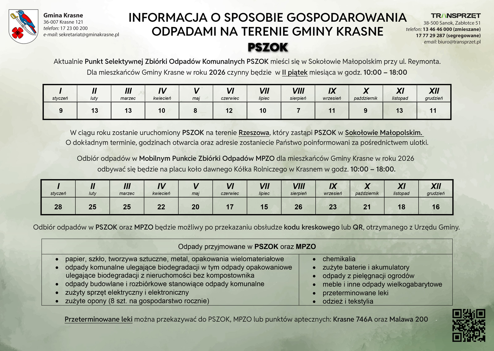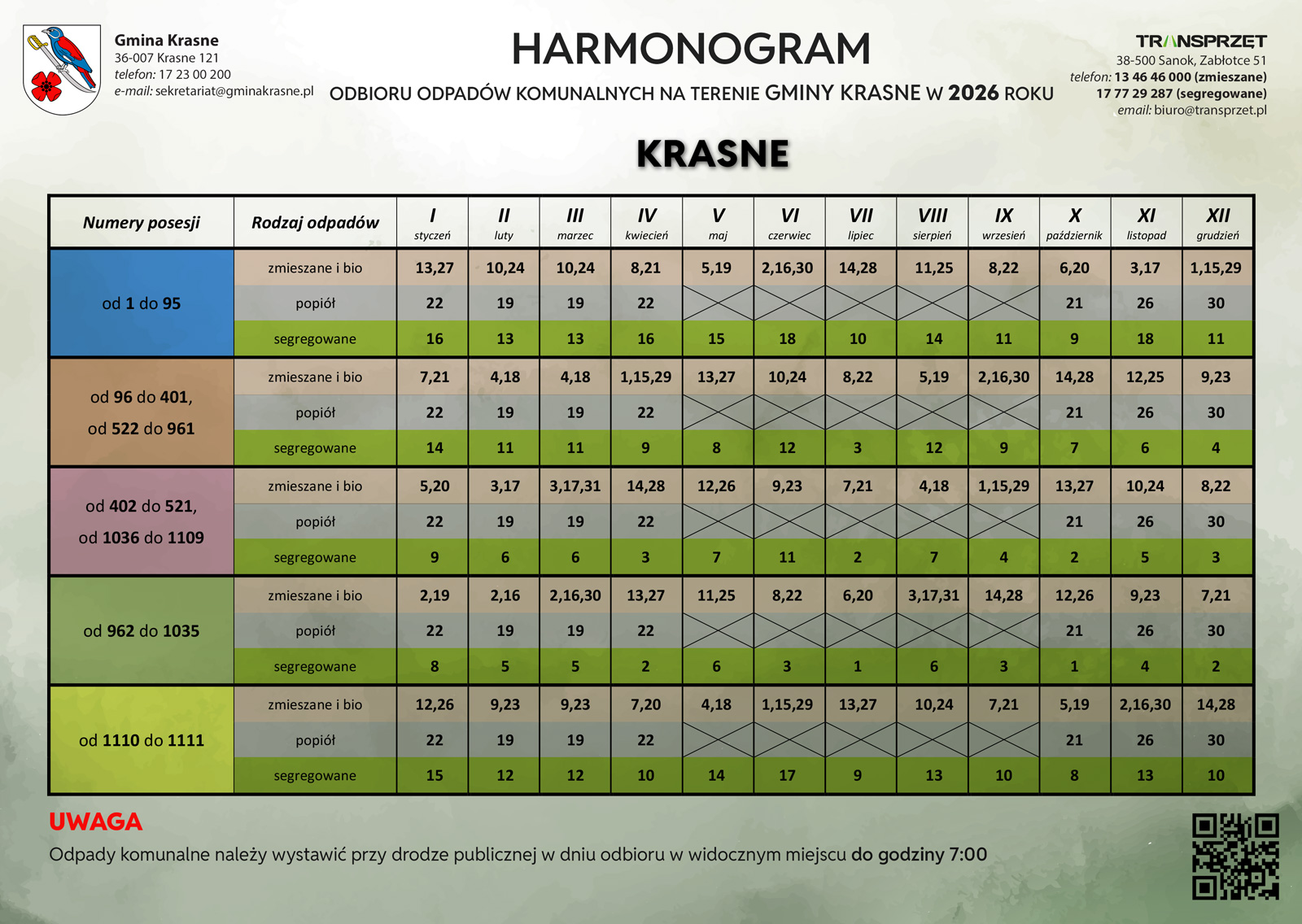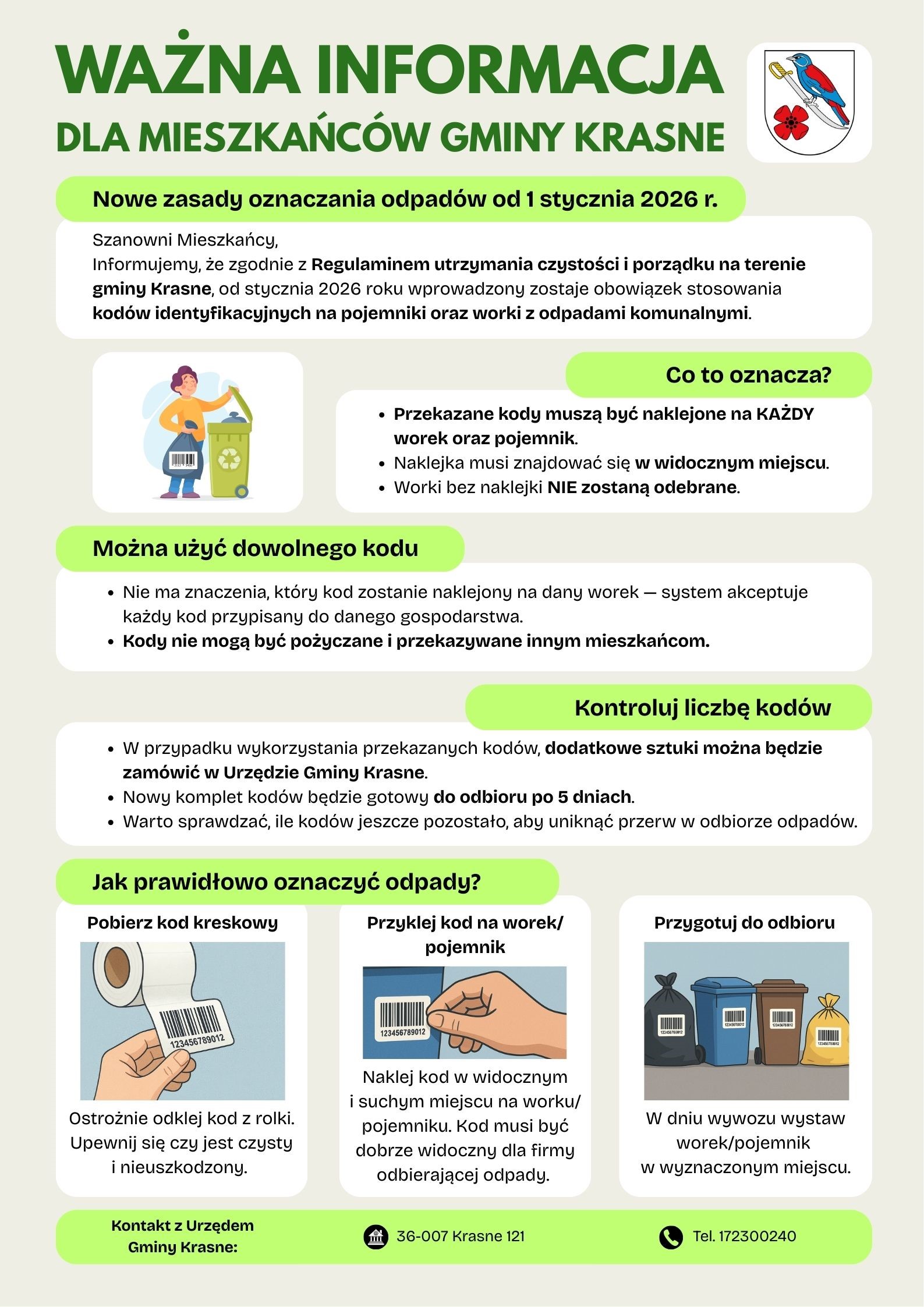 Od 1 stycznia 2026 roku na terenie gminy Krasne obowiązuje system identyfikacji pojemników i worków na odpady komunalne przy użyciu indywidualnych naklejek z kodami kreskowymi. Nowe rozwiązanie ma na celu usprawnienie gospodarki odpadami oraz zwiększenie skuteczności selektywnej zbiórki. Więcej>>